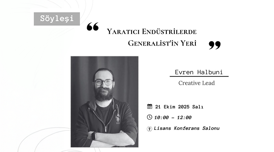 “Yaratıcı Endüstrilerde Generalist’in Yeri” başlıklı söyleşi, 21 Ekim 2025 tarihinde, 10.00-12.00 saatleri arasında Mühendislik ve Mimarlık Fakültesi Kampüsü ve Sanat ve Tasarım Fakültesi Kampüsü Konferans Salonunda gerçekleştirilecek.