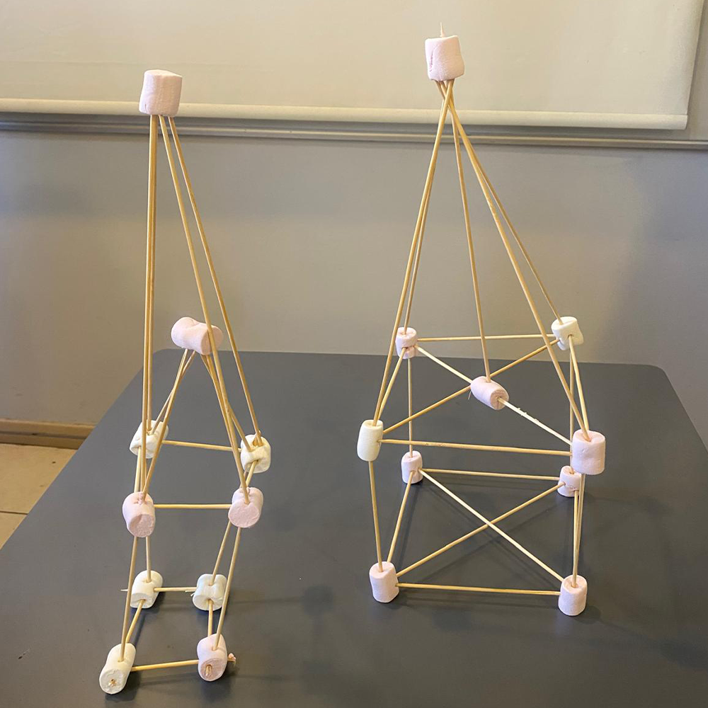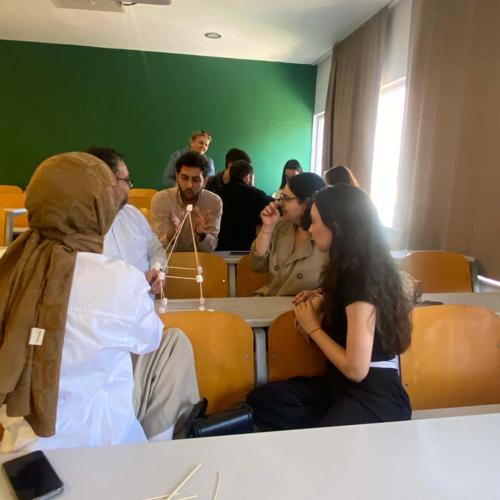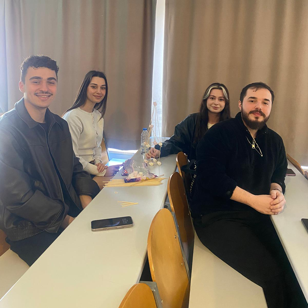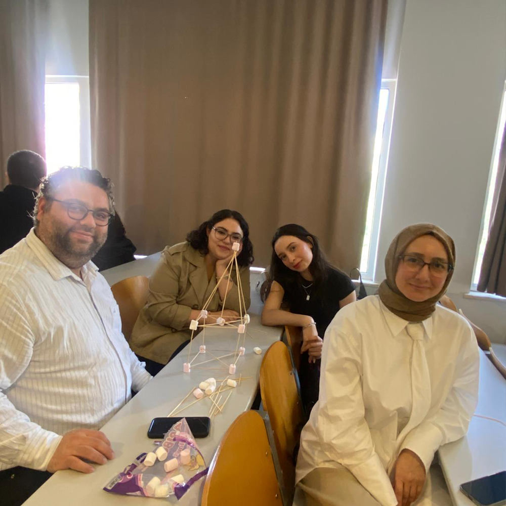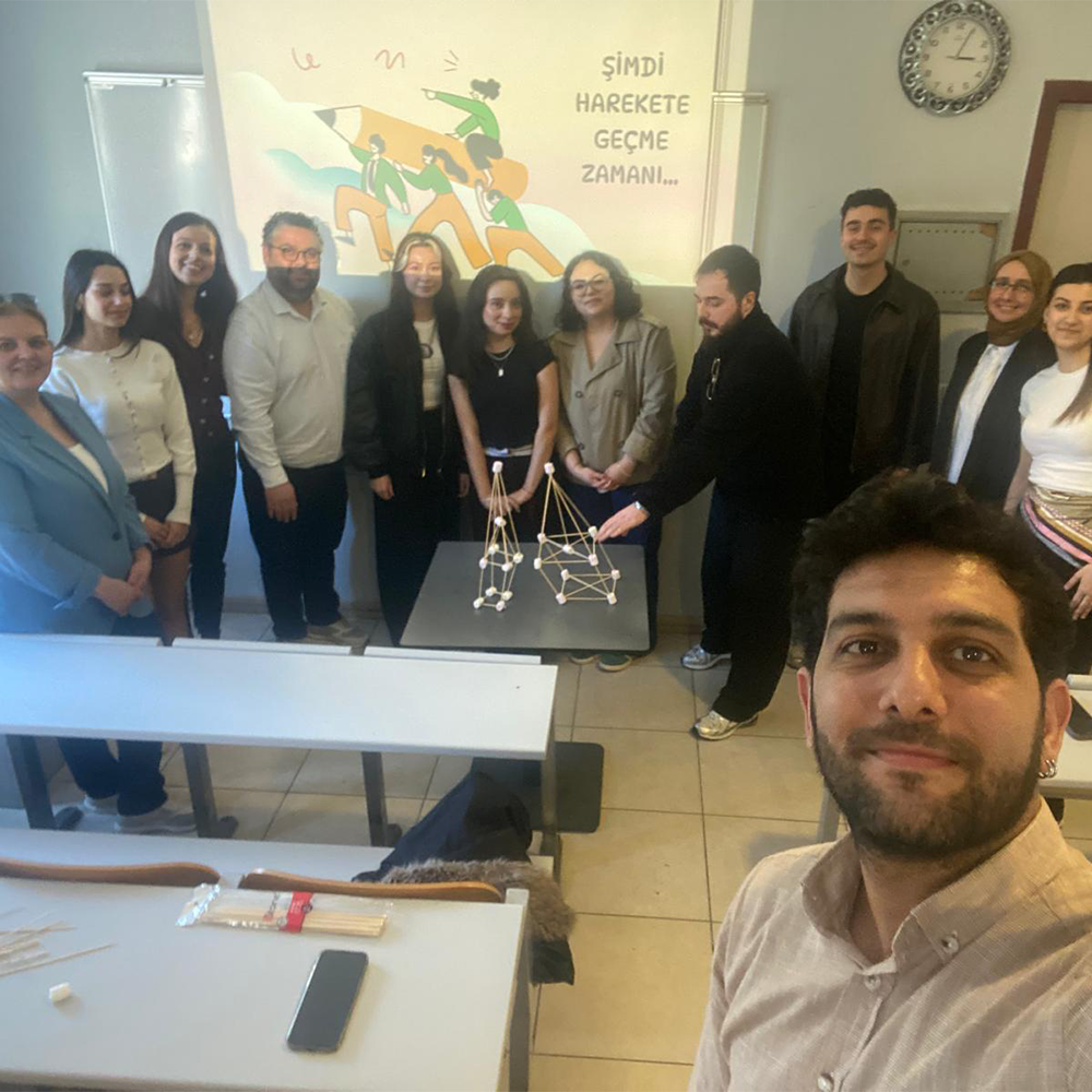 Eğitim sürecinde, öğrencilerin aktif katılımını destekleyen interaktif yöntemler kullanıldı. Mentimeter uygulaması aracılığıyla alınan anlık geri bildirimlerle öğrencilerin görüşleri sürece dahil edilirken, “Marshmallow Challenge (Marşmelov Kule)” etkinliği ile ekip çalışması, problem çözme ve hızlı karar alma becerileri uygulamalı olarak deneyimlendi. Bu uygulama sayesinde öğrenciler, tasarım odaklı düşünme yaklaşımını deneyimleyerek öğrenme fırsatı buldu.